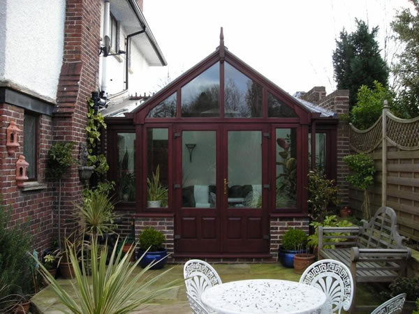 To fully appreciate the natural beauty of hardwood conservatories and hardwood porches you really need to be close enough to see the grain although clicking on the below images will give you a closer look. The color combination of the hardwood and the red brick could not possibly be better and if you have a home similar to this a hardwood conservatory could not fail to impress.